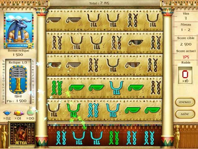 Apaisez les dieux de l'ancienne Egypte dans ce jeu qui vous remuera les méninges. Placez rapidement des symboles colorés à leur place avant que les rangées ne vous dépassent. Jouer intelligemment vous rapportera des gemmes pour acheter des objets bonus et des offrandes spéciales pour plaire aux dieux. Seul un oeil de lynx et des clics rapides seront récompensés par des amulettes magnifiques.